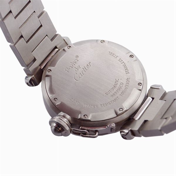 in acciaio, cassa tonda 35 mm. ref. 2550 - 982906 CD quadrante nero con numeri arabi, datario ore 6, vetro zaffiro movimento meccanico a carica automatica, calibro Cartier 054, serie n. 304890, bracciale originale in acciaio con doppia chiusura deployante, cassa quadrante e movimento firmati