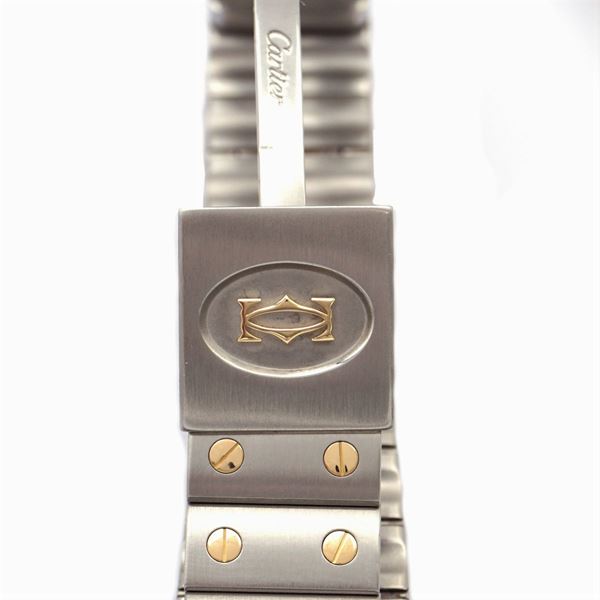 in acciaio e oro giallo 18kt, cassa carré 29x41 mm. ref. 187901 - 51466, quadrante crema con numeri romani, datario ore 6, vetro zaffiro, calibro Cartier 87, bracciale originale in acciaio e oro con chiusura deployante, cassa quadrante e movimento firmati