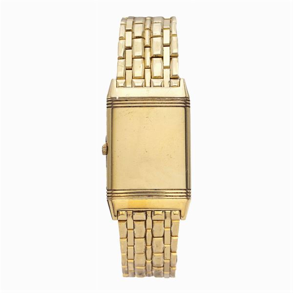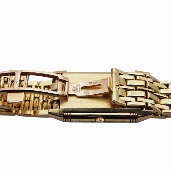 peso 108 gr.in oro giallo 18kt, cassa rettangolare 39x23 mm.  ref. 250.1.86 - 1701595, quadrante duodial argentato con numeri arabi, vetro zaffiro, movimento meccanico a carica manuale, calibro Jager Le Coultre 846, bracciale originale in oro giallo 18kt con chiusura deployante, cassa, quadrante e movimento firmati