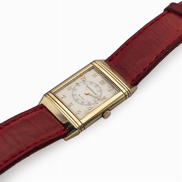 in oro giallo 18kt, cassa rettangolare 26x23 mm. ref. 618491 - 1551172 interna 339, quadrante argentato con numeri arabi, segni di usura, movimento meccanico a carica manual, calibro J. Le Coultre 846, cinturino in pelle con fibbia originale in oro giallo 18kt, cassa quadrante e movimento firmati