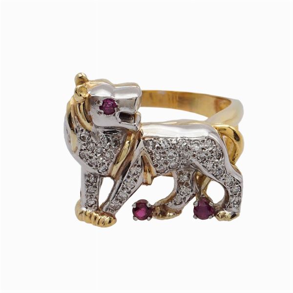 peso 14 gr.a foggia di leone con incastonati diamanti huit-huit e rubini tondi, misura 20
