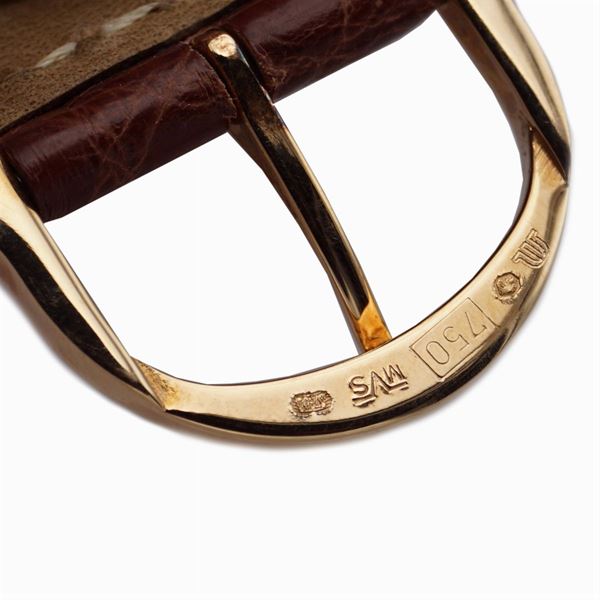 in oro giallo 18kt, cassa rettangolare 44x27 mm. ref. 35830, quadrante duodial argentato liscio e guilloché con numeri romani e contasecondi ore 6, vetro zaffiro, movimento a vista meccanico a carica manuale, calibro ML 35, cinturino con fibbia originale in pelle e oro giallo 18kt, cassa quadrante e movimento firmati