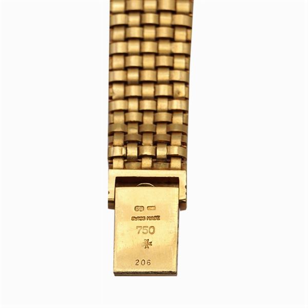 peso 52 gr.in oro giallo 18kt, cassa rettangolare 20x16 mm. ref. 547338 - 15006 quadrante champagne con indici, vetro zaffiro, movimento meccanico a carica manuale, calibro Vacheron & Constantin 1032, bracciale originale a tessuto in oro giallo 18kt lavorato a cestino, con chiusura firmata e numerata, lunghezza 18,5 cm. cassa quadrante e movimento firmati