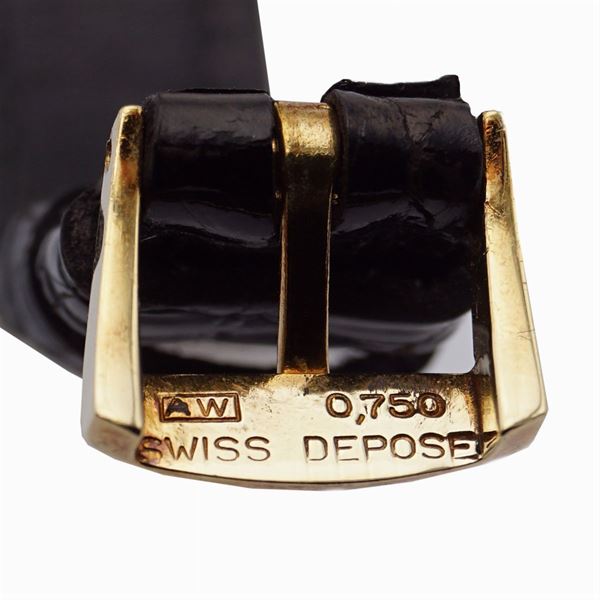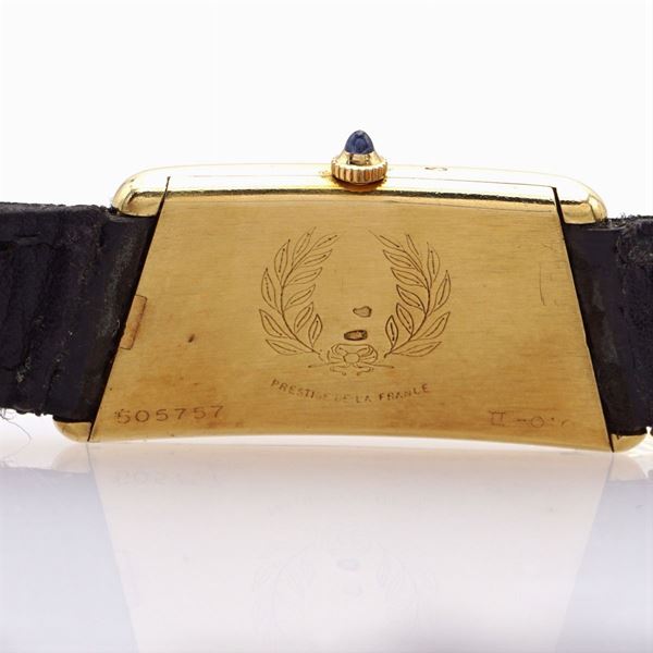 in oro giallo 18kt, cassa di forma 18x37 mm. ref. 505757 quadrante nero con indici dorati, vetro zaffiro, movimento meccanico a carica manuale, calibro K 1050/B, cinturino in pelle con fibbia originale in oro giallo 18kt, cassa quadrante e movimento firmati