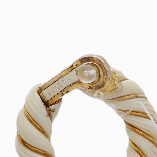 peso 25 gr.realizzati in avorio lavorato a torchon e oro giallo 18kt, diametro 4 cm. completi di astuccio in tessuto