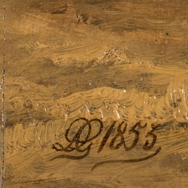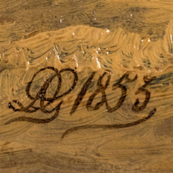 46,5x59 cm."Cavalli e cavaliere", olio su tavola, siglato e datato DG 1853 in basso a destra, entro cornice