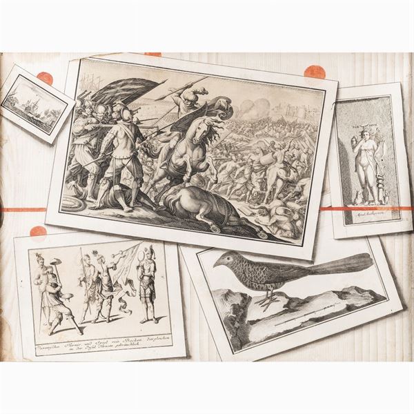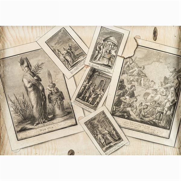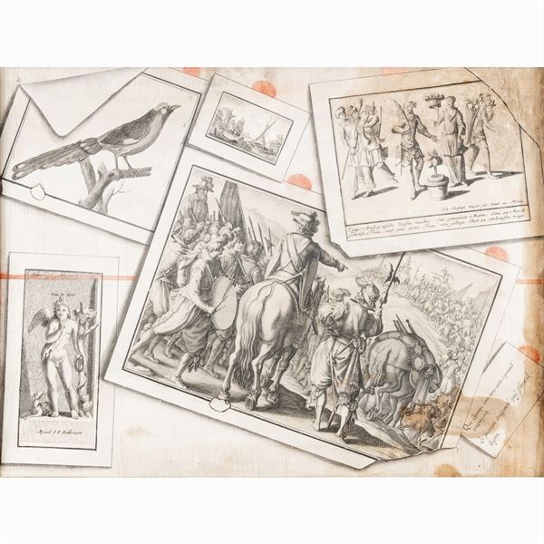misura massima 40x54,5 cm."Trompe l’oeil", tre stampe acquarellate su carta applicata su tela, entro cornici