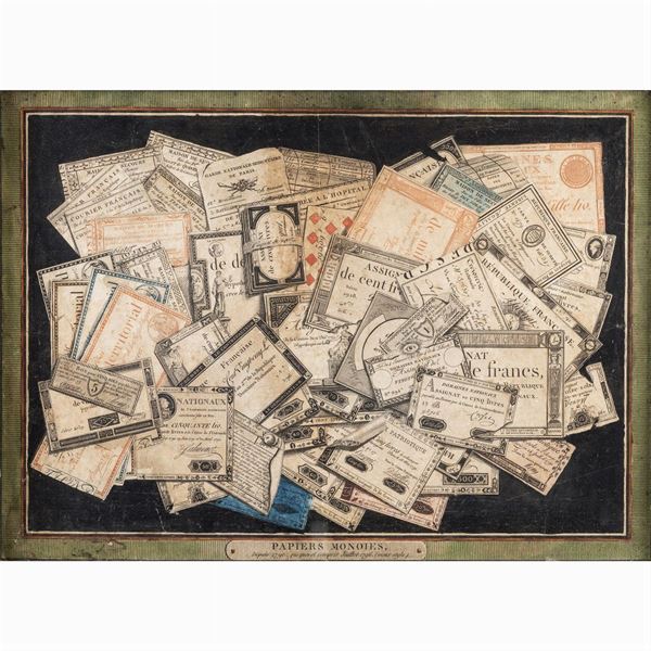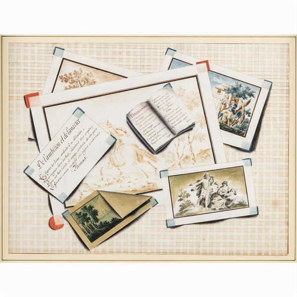 30x40 cm. - 36x49 cm."Trompe l’oeil", un acquarello e una stampa acquarellata su carta, entro cornici