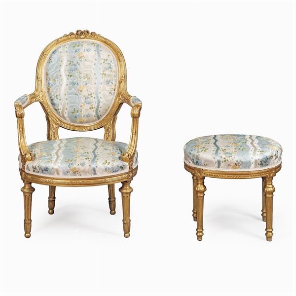 89x58x48 cm. 2 poltrone - 95x55x55 cm. poltrona - 45x52x52 cm. sgabellointagliato con motivi floreali, vegetali, gambe scanalate con braccioli di linea mossa, sedute e schienali imbottiti, una poltrona di manifattura diversa ma compatibile