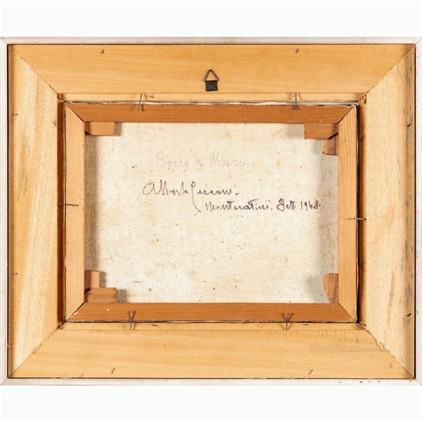 30x40 cm."Bocca di Magra", olio su tela, firmato in basso a sinistra, firmato e datato 1968 sul retro, entro cornice