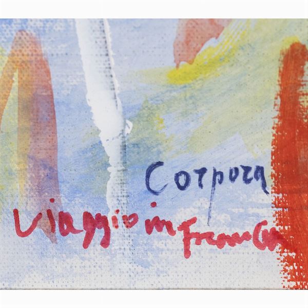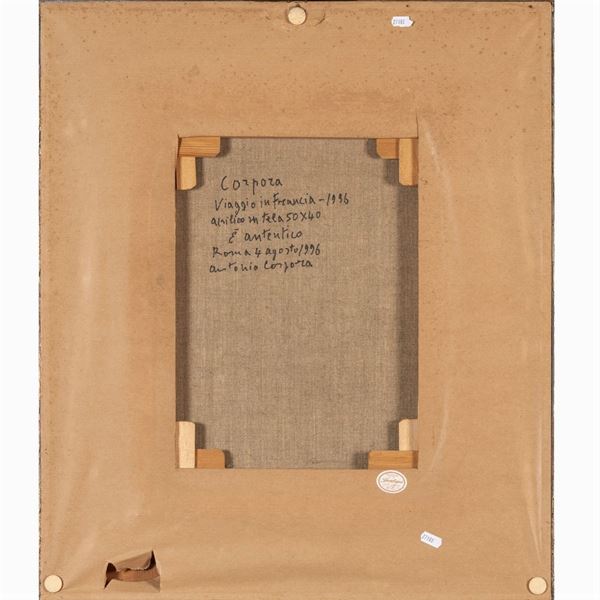 50x40 cm."Viaggio in Francia", 1996, acrilico su tela, firmato e titolato in basso a destra e sul retro, entro cornice