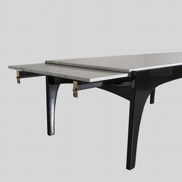 Chiuso 75 x 200 x 100 cm. - Aperto 75 x 320 x 100 cm.tavolo allungabile mod. Partenio, in legno e metallo laccato, piano in marmo bianco di Carrara