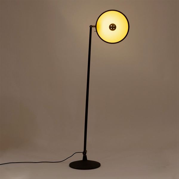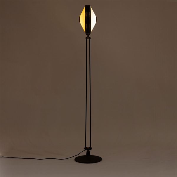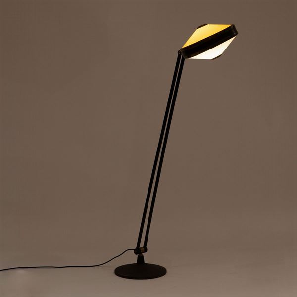 h. 154 cm.lampada da terra mod. 4067 in ottone, metallo verniciato e perspex giallo e bianco, marchio del produttore