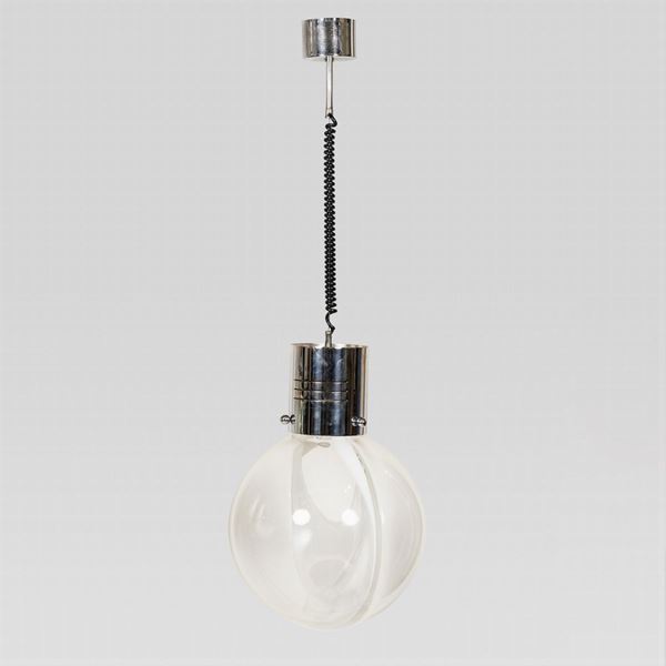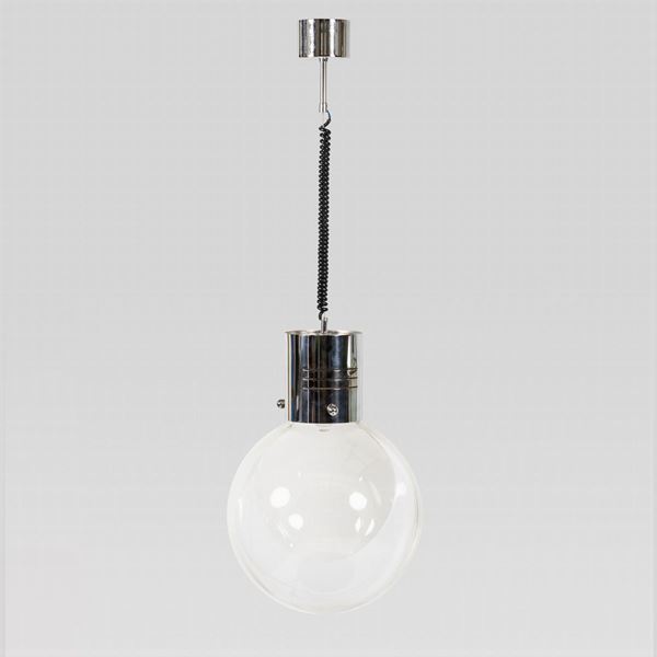 h. 120 cm.coppia di lampade a sospensione mod. Membrane in metallo cromato e vetro soffiato