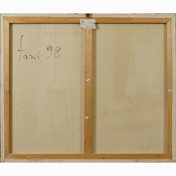 100x120 cm." Conversazione", 1998, olio su tela, firmato, datato e titolato sul retro, entro cornice