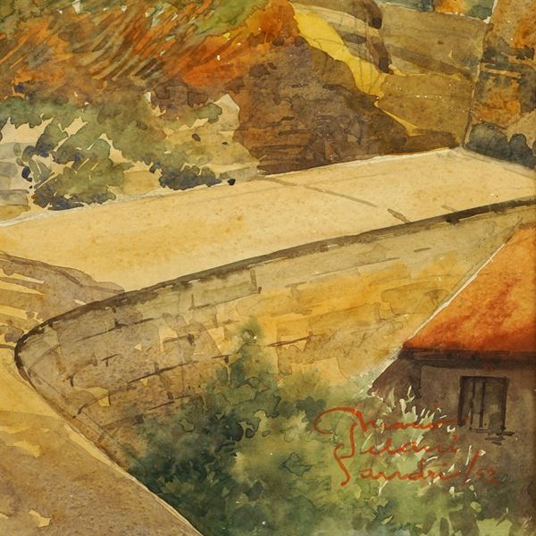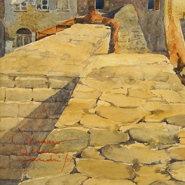 50x70 cm."Scorci di Camogli", 1952, coppia di acquarelli su carta, firmati in basso a destra e a sinistra, entro cornici