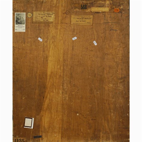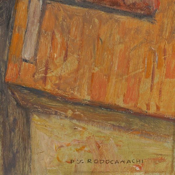 80x65 cm."Casa ad Acqui", olio su tavola, firmato in basso a destra, etichetta sul retro della III Mostra Nazionale di Pittura - Premio città di Monza