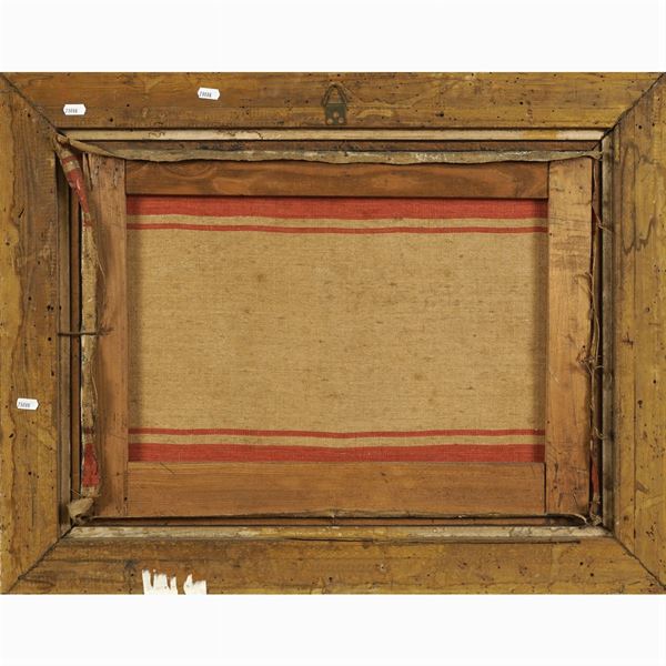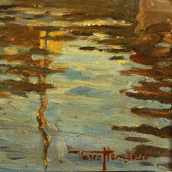 "Barche in porto", olio su tela, firmato in basso a destra, entro cornice