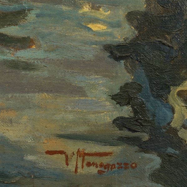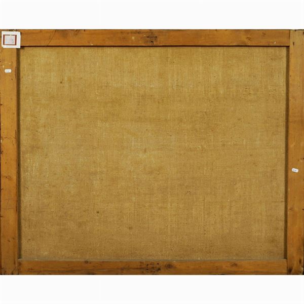 "Barche in porto", olio su tela, firmato in basso a destra, entro cornice