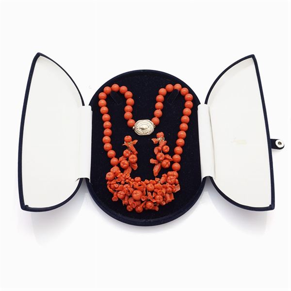 peso 90 gr.composta da collana e orecchini, un filo di sfere in corallo 9 mm. con chiusura in oro giallo 9kt lunghezza 44,5 cm. - orecchini pendenti lunghezza 4,5 cm. una foglia mancante