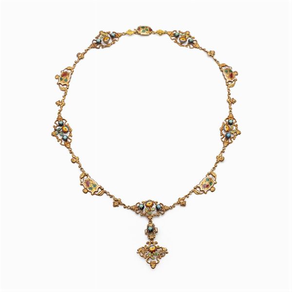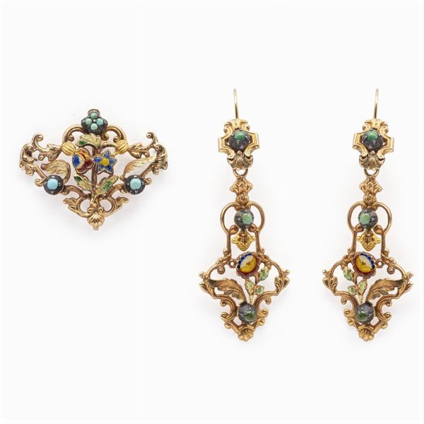 peso 28 gr.dipinti con smalti policromi e impreziositi da turchesi naturali, composta da collana con pendente lunghezza 44,5 cm. , orecchini pendenti a monachina lunghezza 5,5 cm. e spilla misure 3x2,5 cm.
