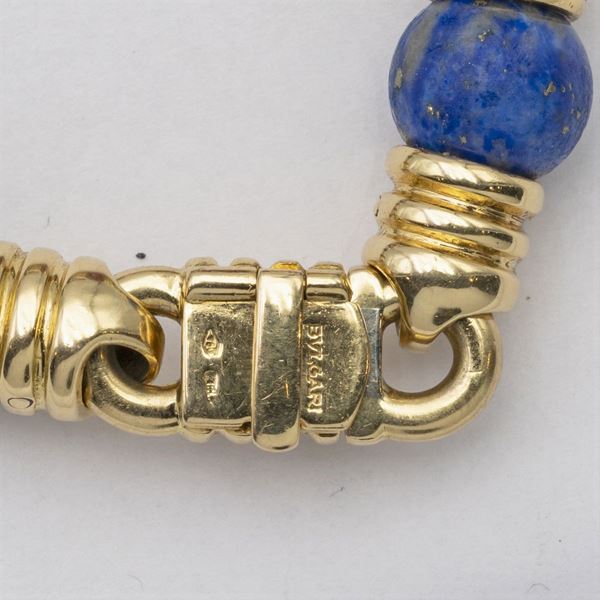 peso 56 gr.maglie in oro giallo 18kt alternate da sfere in lapislazzulo, corniola e calcedonio verde, completo di scatola, lunghezza 19 cm.