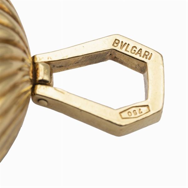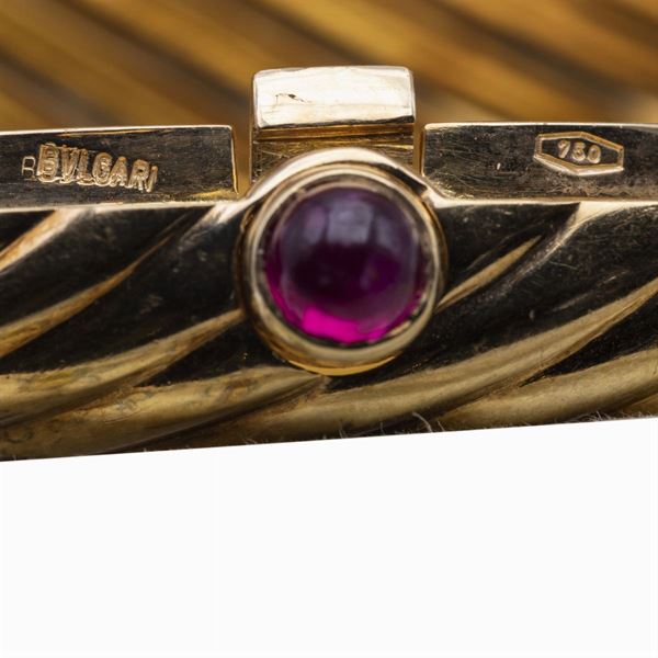 peso 33 gr.in oro giallo 18kt, chiusura a scatto impreziosita da un rubino taglio cabochon, misure 4,8x3 cm. completo di custodia in tessuto