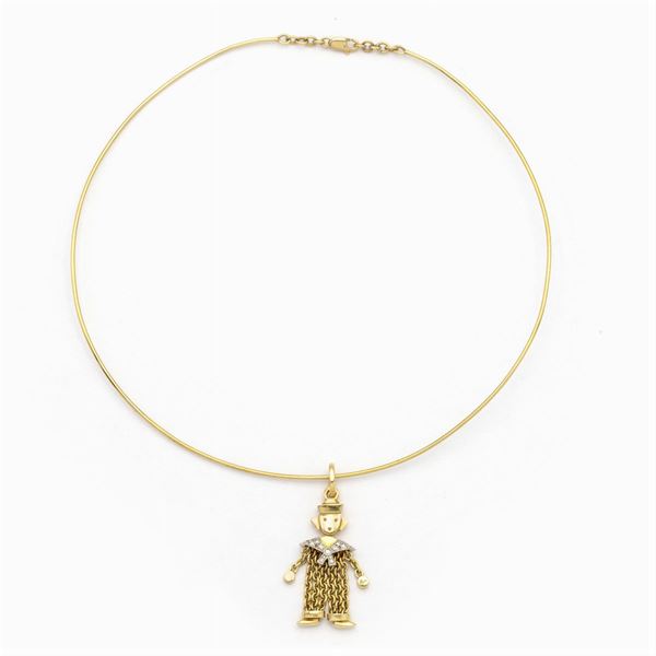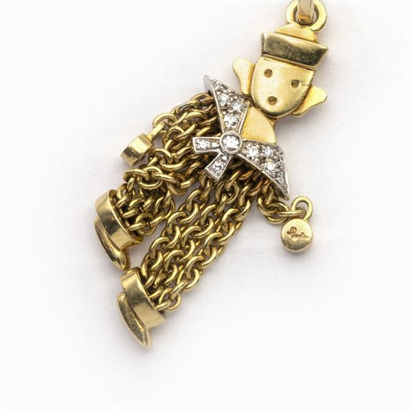 peso 22 gr.in oro a due colori 18kt e diamanti taglio brillante misure 4,5x2 cm. , completo di golino in oro giallo 18kt non firmato e scatola, diametro 14 cm.