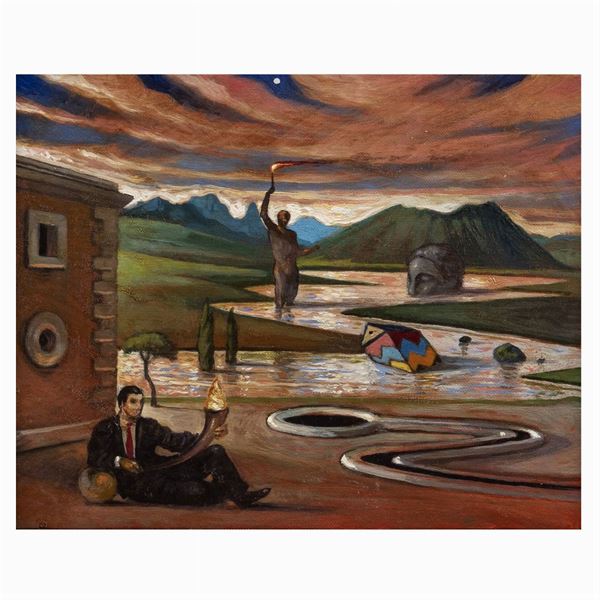 20x25 cm."Paesaggio fantastico", olio su tela applicata su tavola, entro cornice
