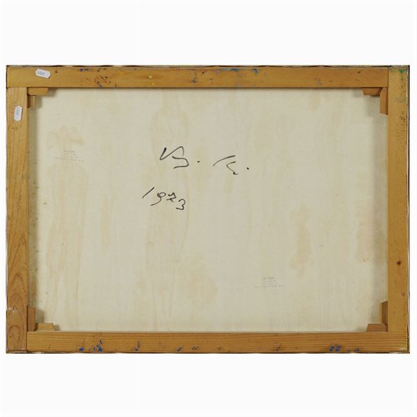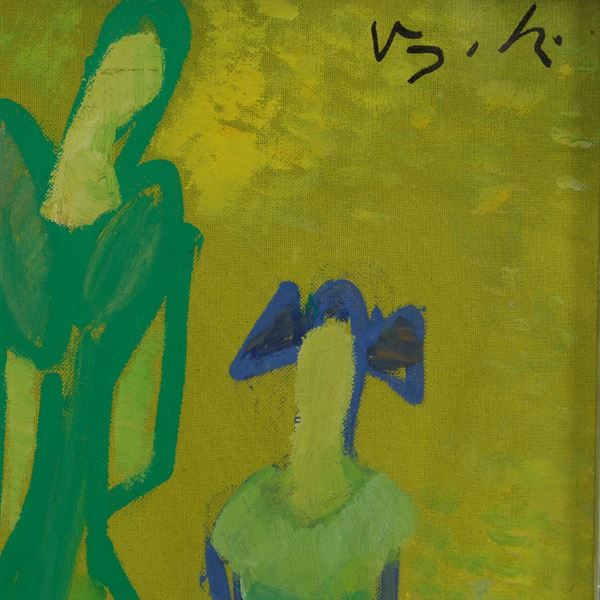 50x70 cm."Sei figure", 1973, olio su tela, firmato e datato sul retro, entro cornice