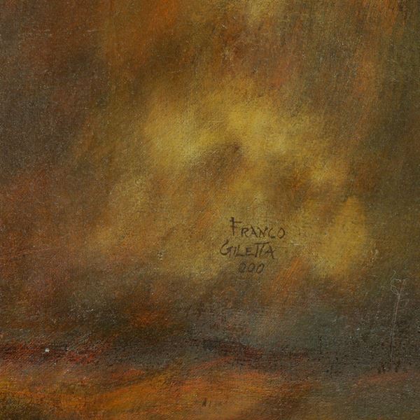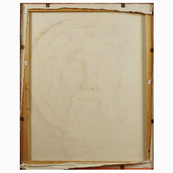 100x80 cm."Bocca della verità", 2000, olio su tela, firmato e datato in basso a destra, firmato, datato e titolato sul retro, entro cornice