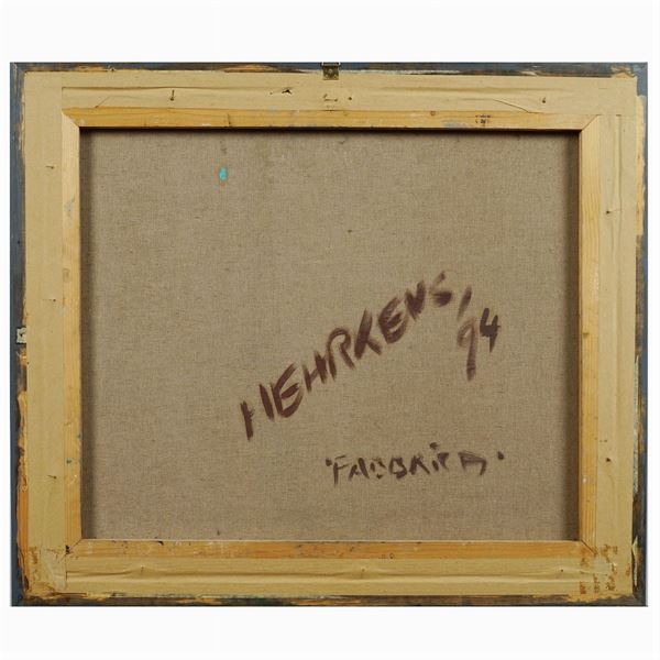 50x60 cm."Fabbrica", 1994, olio su tela, firmato, datato e titolato sul retro, entro cornice
