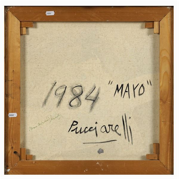 50x50 cm."Mayo", 1984, olio su tela, firmato in alto a destra, firmato, datato e titolato sul retro, entro cornice
