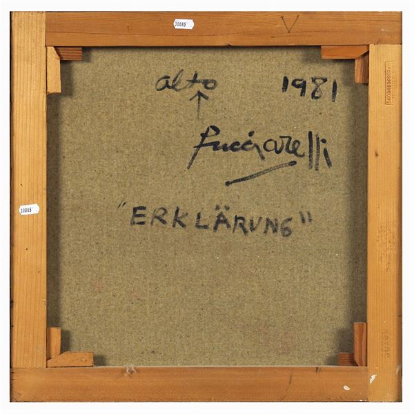 50x50 cm."Erklärung", 1981, olio su tela, firmato in alto a destra, firmato, datato e titolato sul retro, entro cornice