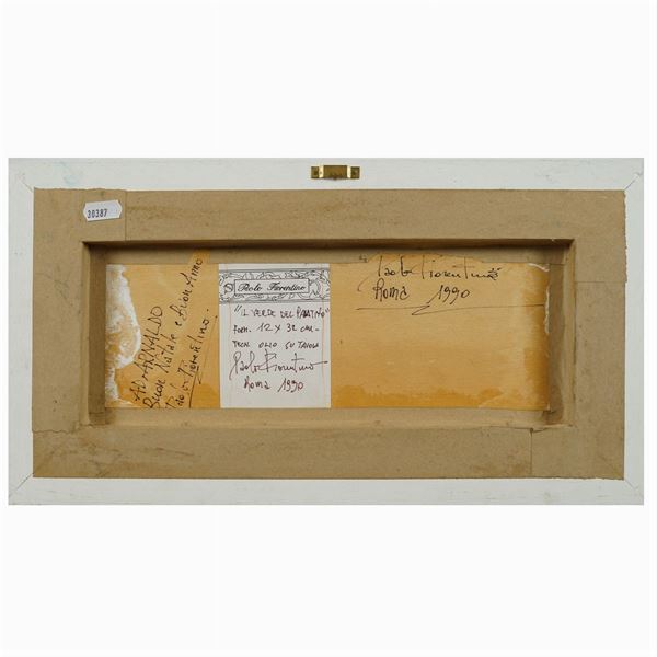 12x32 cm."Il verde del Palatino", 1990, olio su tavola, firmato, datato e titolato sul retro, entro cornice