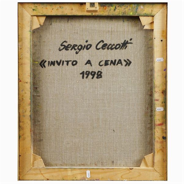 60x50 cm."Invito a cena", 1998, olio su tela, siglato in alto a destra SC 98, firmato datato e titolato sul retro, entro cornice