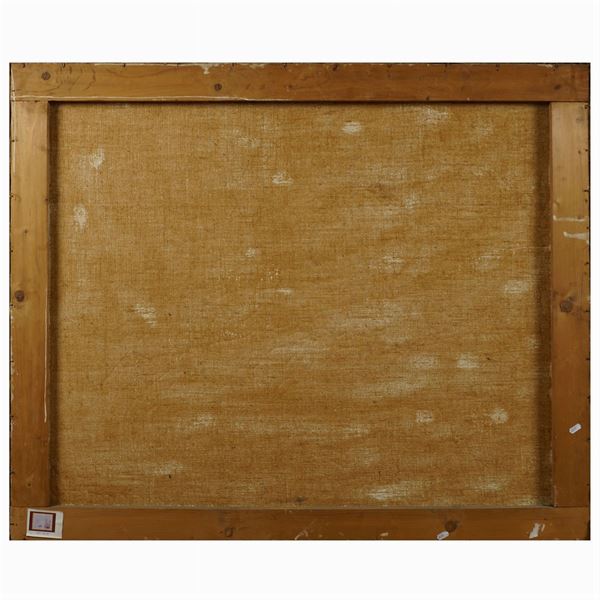100x120 cm."Barche in porto", olio su tela, firmato in basso a destra