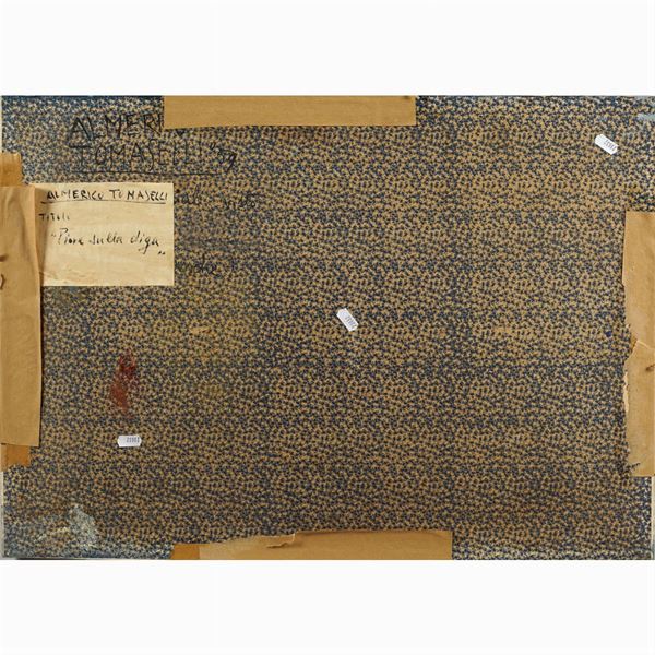 50x70 cm."Piove sulla diga", olio su cartoncino telato, firmato in basso a destra