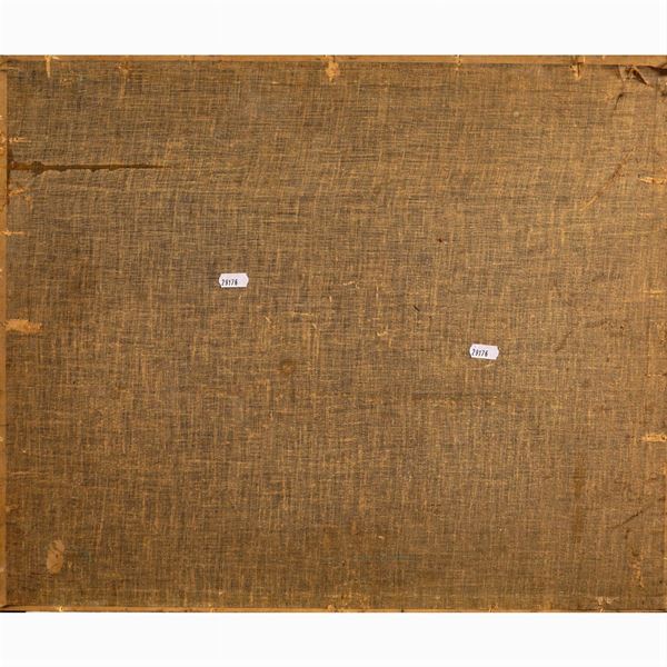 50x60 cm."Partita a carte", 1961, olio su tela applicata su tavola, firmato e datato in basso a sinistra, entro cornice