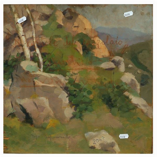 "Il cortile del calzolaio", 1928, olio su tavola, firmato e datato in basso a sinistra