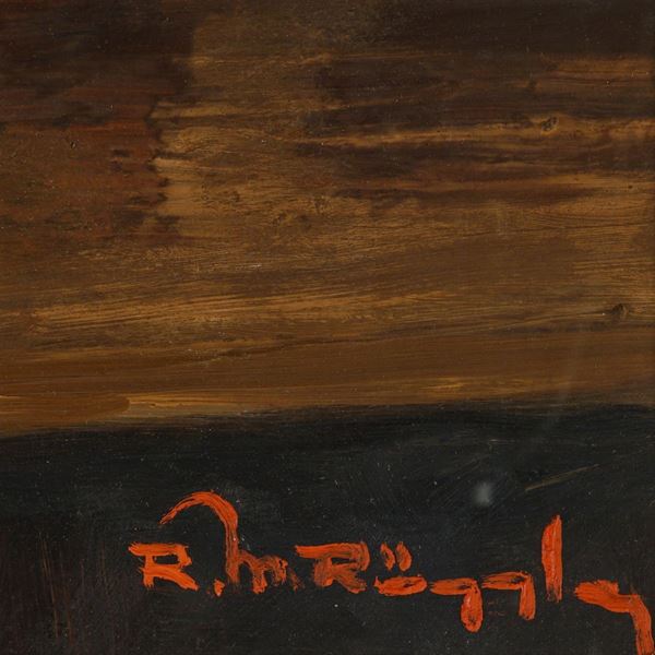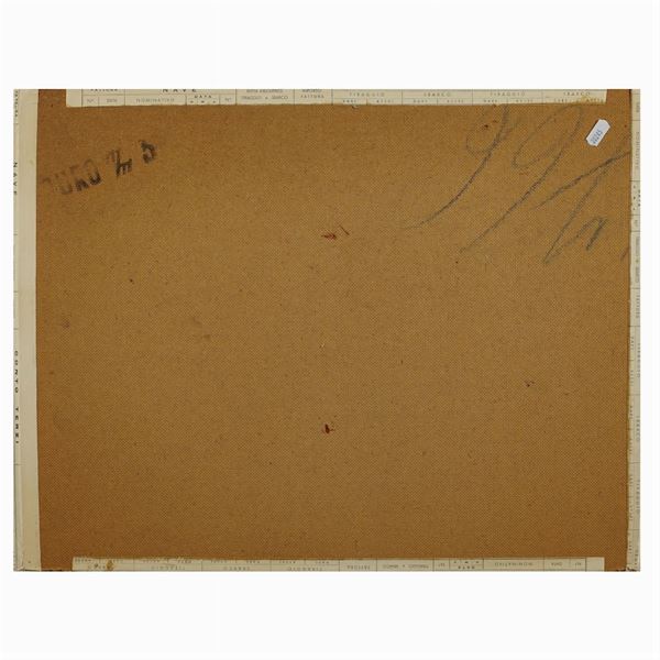 "Natura morta con vasellame", olio su cartoncino telato, firmato in basso a destra