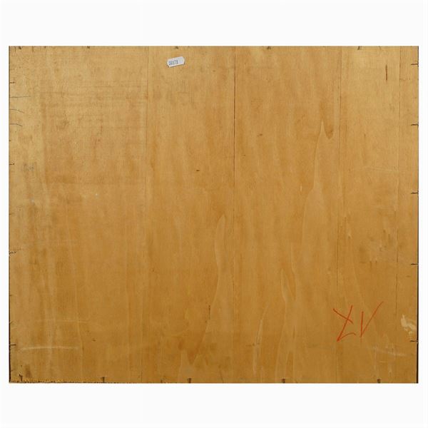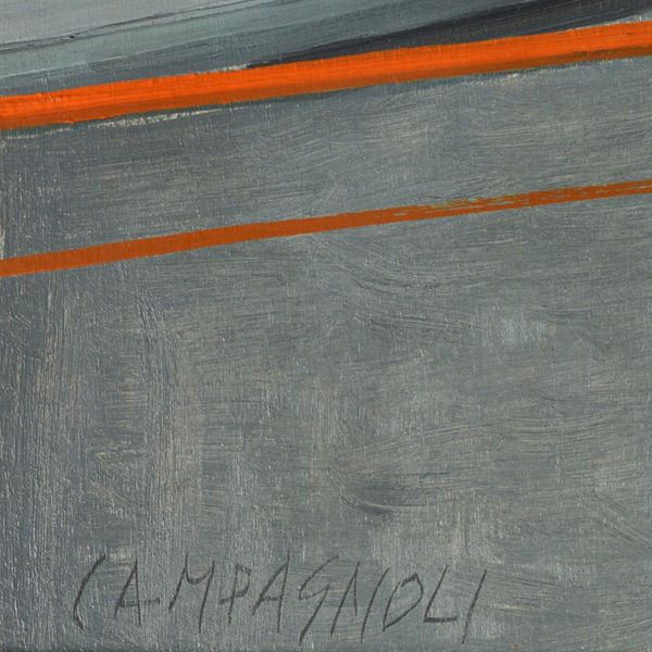"Diga con operai", olio su tela, firmato in basso a sinistra