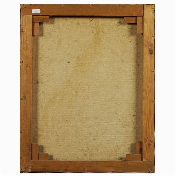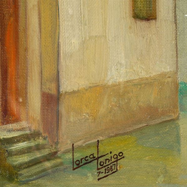 "Scorcio di paese", 1987, olio su tela, firmato e datato in basso a sinistra, alcune cadute di colore