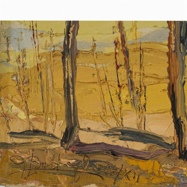 "Paesaggio con alberi", 1966, olio su tavola, firmato in basso a sinistra