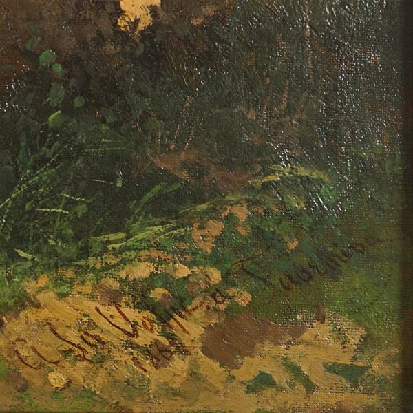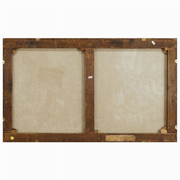 64x108 cm."Veduta del teatro di Taormina con figure", 1868, olio su tela, firmato e datato in basso a destra, entro cornice