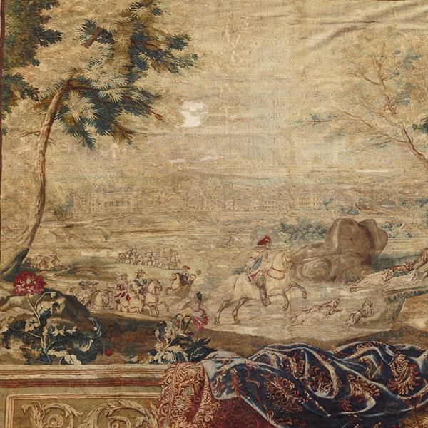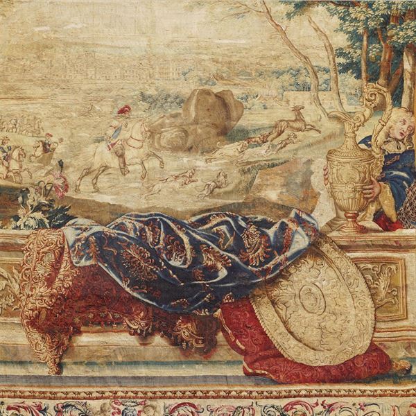 327x320 cm.raffigurante scena di caccia, difetti e usure