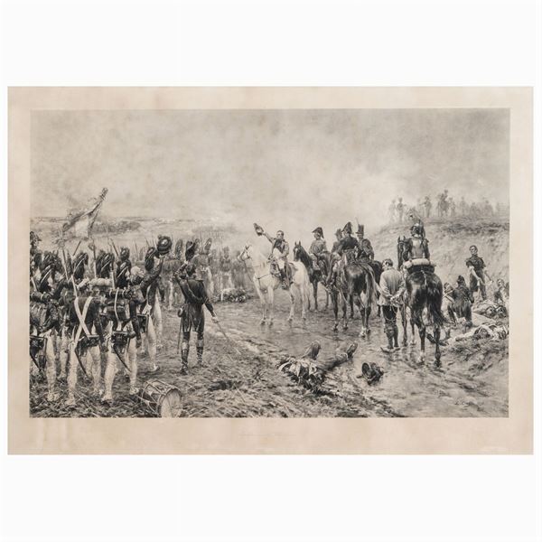 75x97 cm."Napoleone e la vecchia guardia", stampa litografica, entro cornice