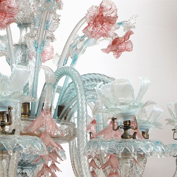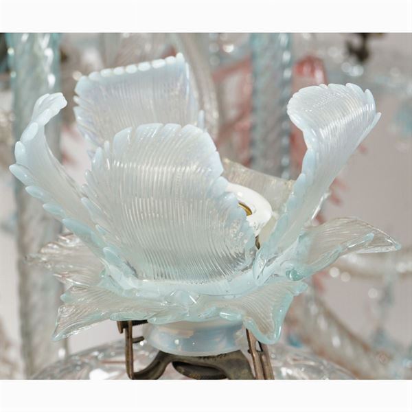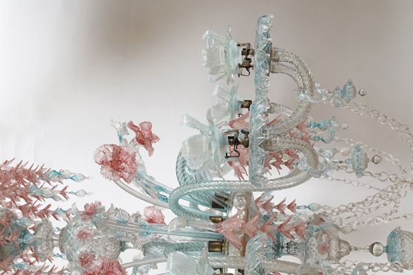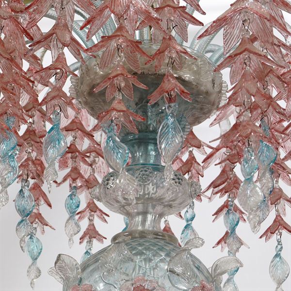 135x130 cm.in vetro incolore e policromo rosa e azzurro, bracci ricurvi collegati da catenella e ornati da pendenti alternativamente disposti a due diverse altezze e intervallati a foglie e fiori policromi di diversa foggia, rotture e mancanze