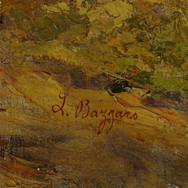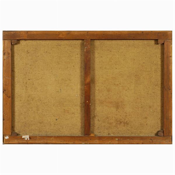 90x132 cm."Scena campestre", olio su tela, firmato in basso a sinistra, entro cornice