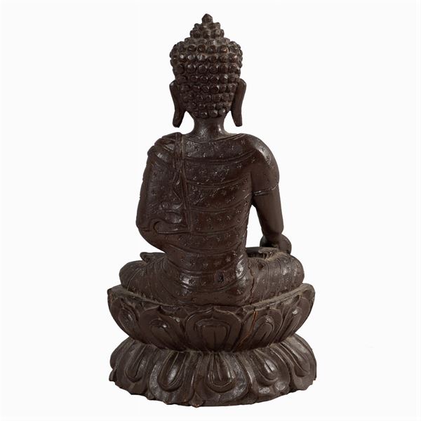 h. 30 cm.scolpita e modellata a foggia di Buddha seduto su fiore di loto, difetti